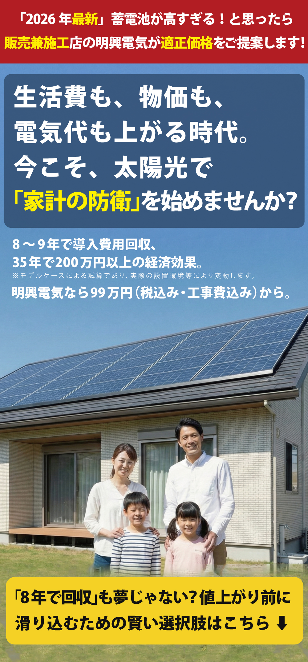 弊社は埼玉県で数社しか選ばれない「住宅用太陽光 埼玉県あんしんモデル」登録施工店です。数多くの施工店業者の中から「どこに頼むか?」「高額な請求をされたりしないか?」「仕事をお願いしても他の悪質な業者に丸投げされないだろうか?」という不安はコバトン(埼玉県)に選ばれ愛された私たち明興電気が解消します!